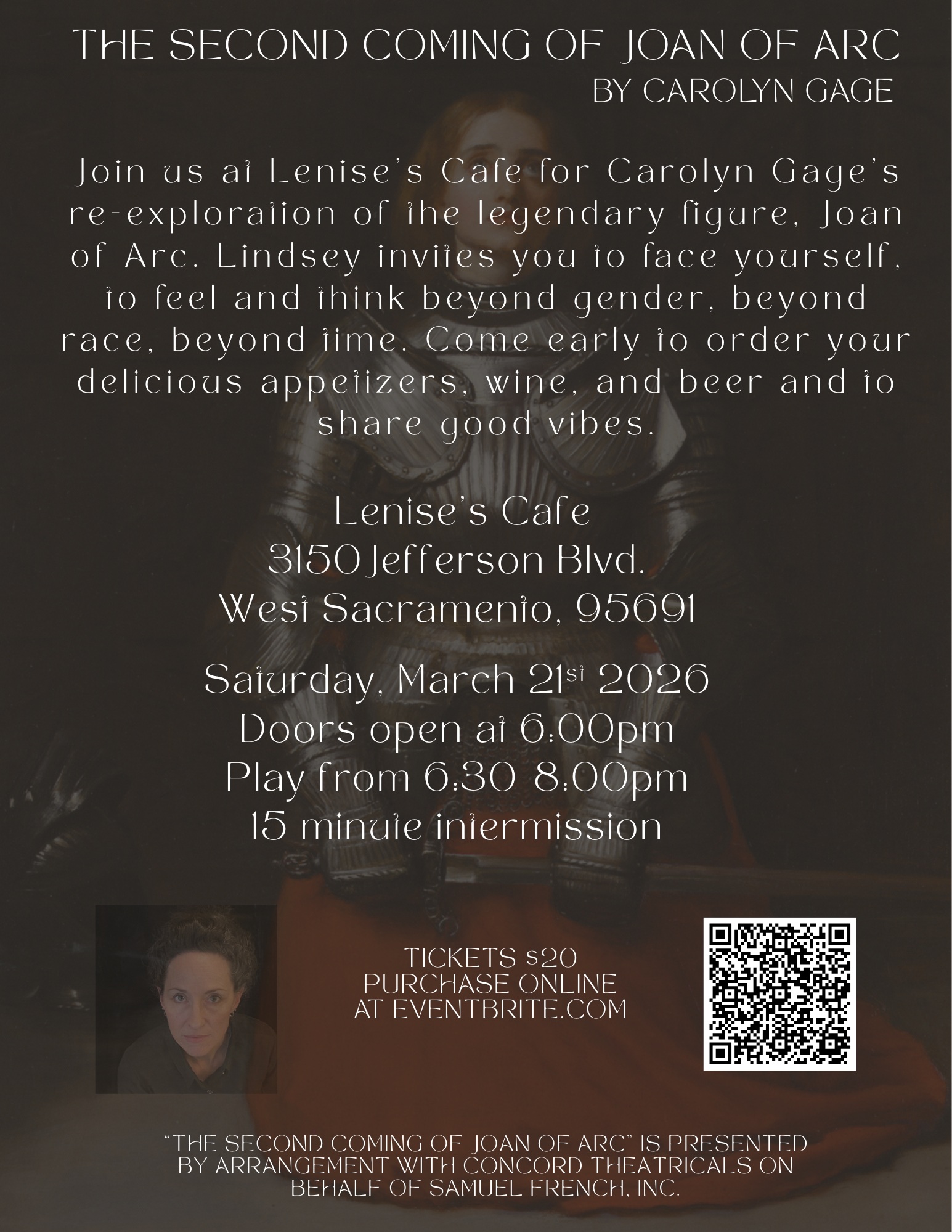 Join us at Lenise’s Cafe for Carolyn Gage’s re-exploration of the legendary figure, Joan of Arc. Lindsey invites you to face yourself, to feel and think beyond gender, beyond race, beyond time. Come early to order your delicious appetizers, wine, and beer and to share good vibes.